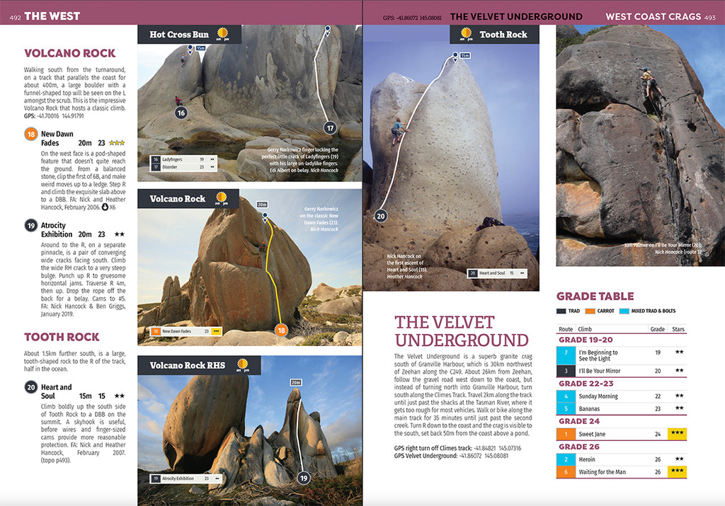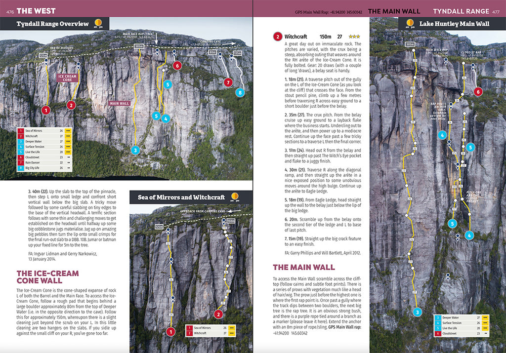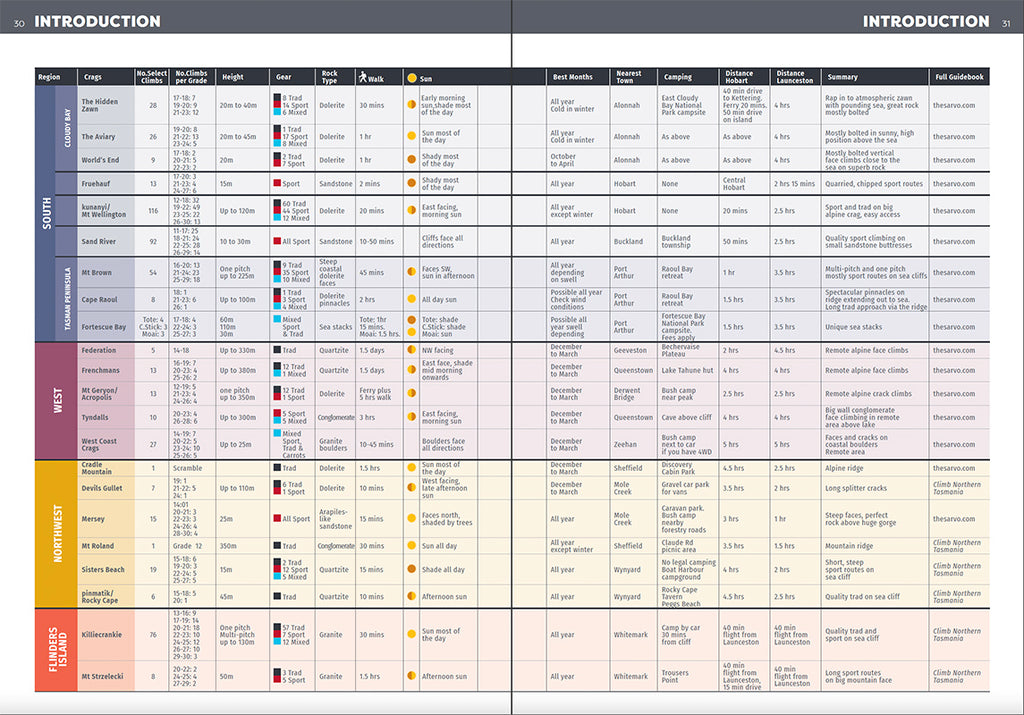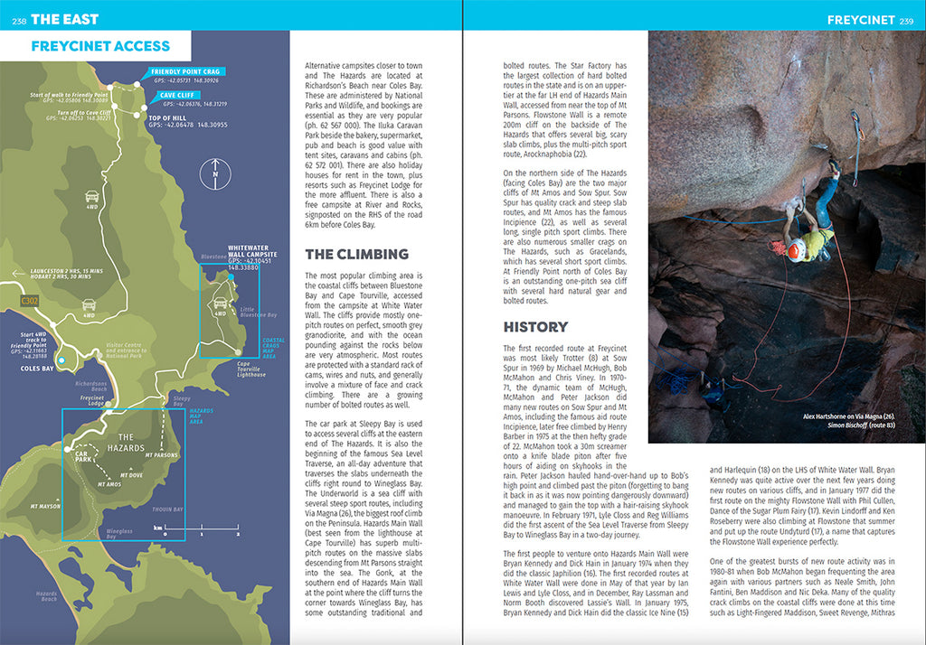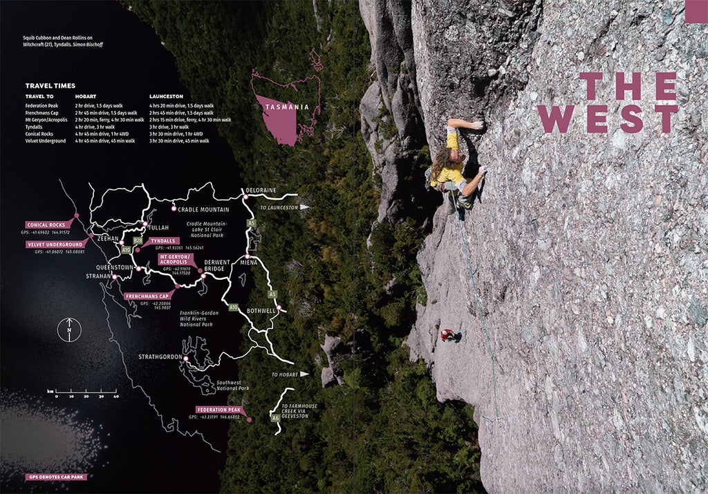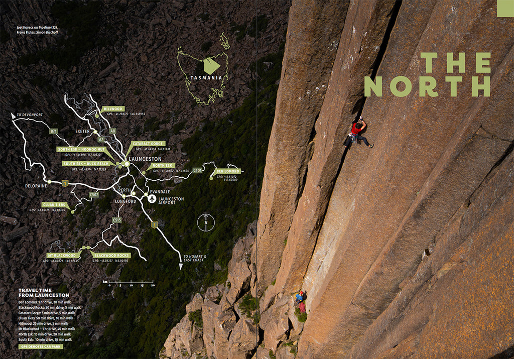Africa, Bare Rock, Ben Lomond, Blackwood Rocks, Cape Raoul, Cataract Gorge, Cloudy Bay, Cluan Tiers, Cradle Mountain, Devils Gullet, Federation Peak, Flinders Island, Frenchmans Cap, Freycinet, Fruehauf, Mersey Cliffs, Mt Blackwood, Mt Brown, Mt Geryon, Mt Roland, North Esk, North Sister, Organ Pipes, Pavement Bluff, Rocky Cape, Sand River, Sisters Beach, South Esk, South Sister, Stacks Bluff, Teapot Rocks, The Moai, The Acropolis, Totem Pole, Township Creek, Tyndall Range, West Coast Crags and Bouldering Guide.