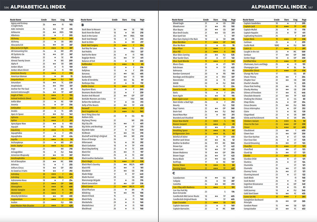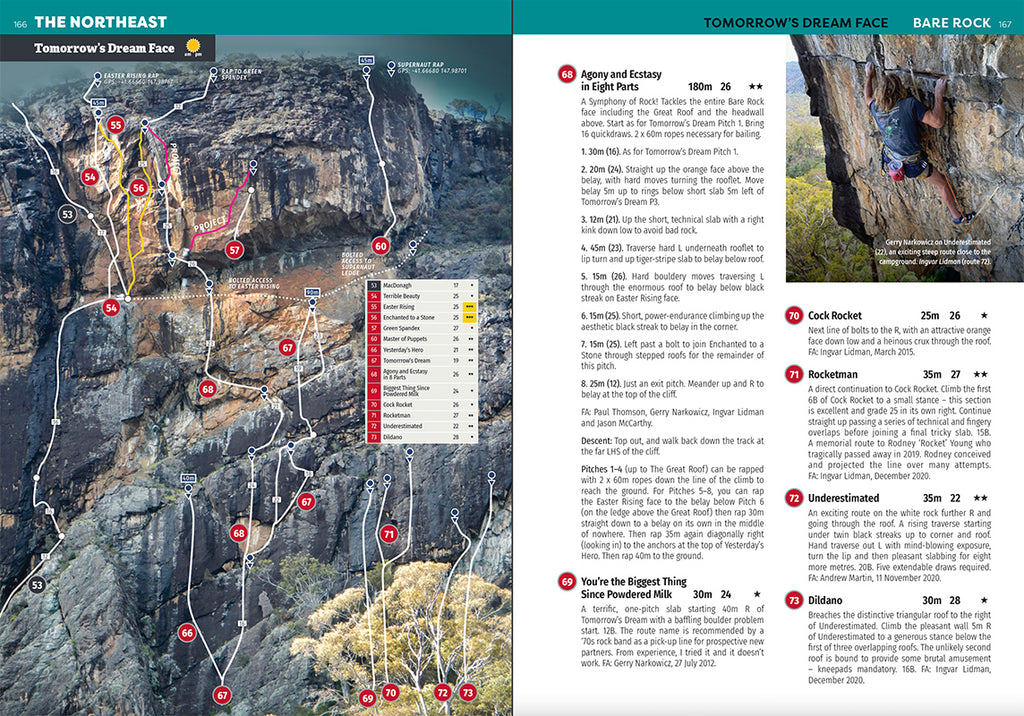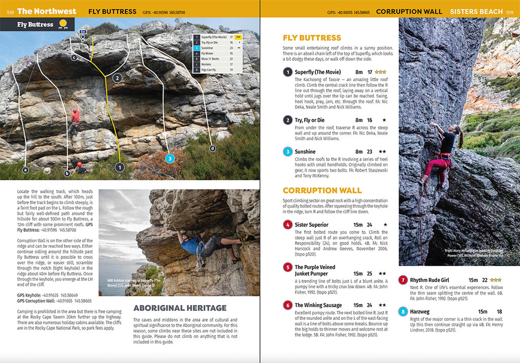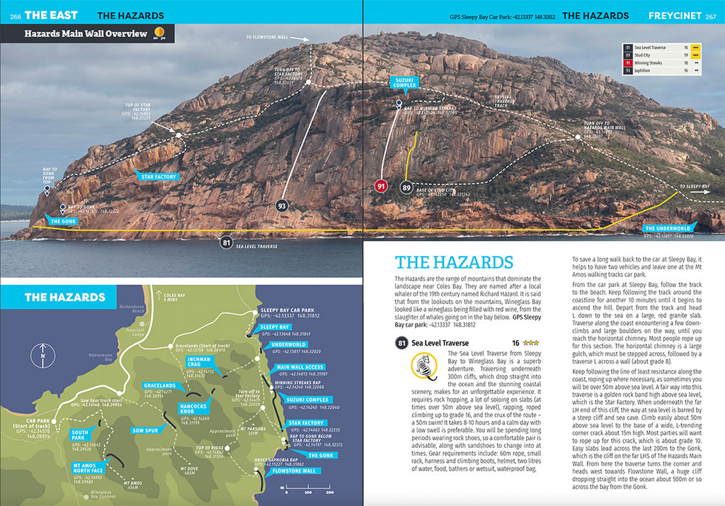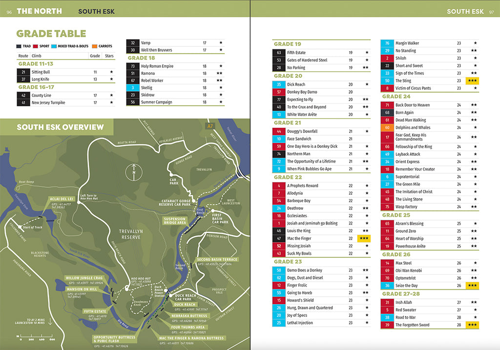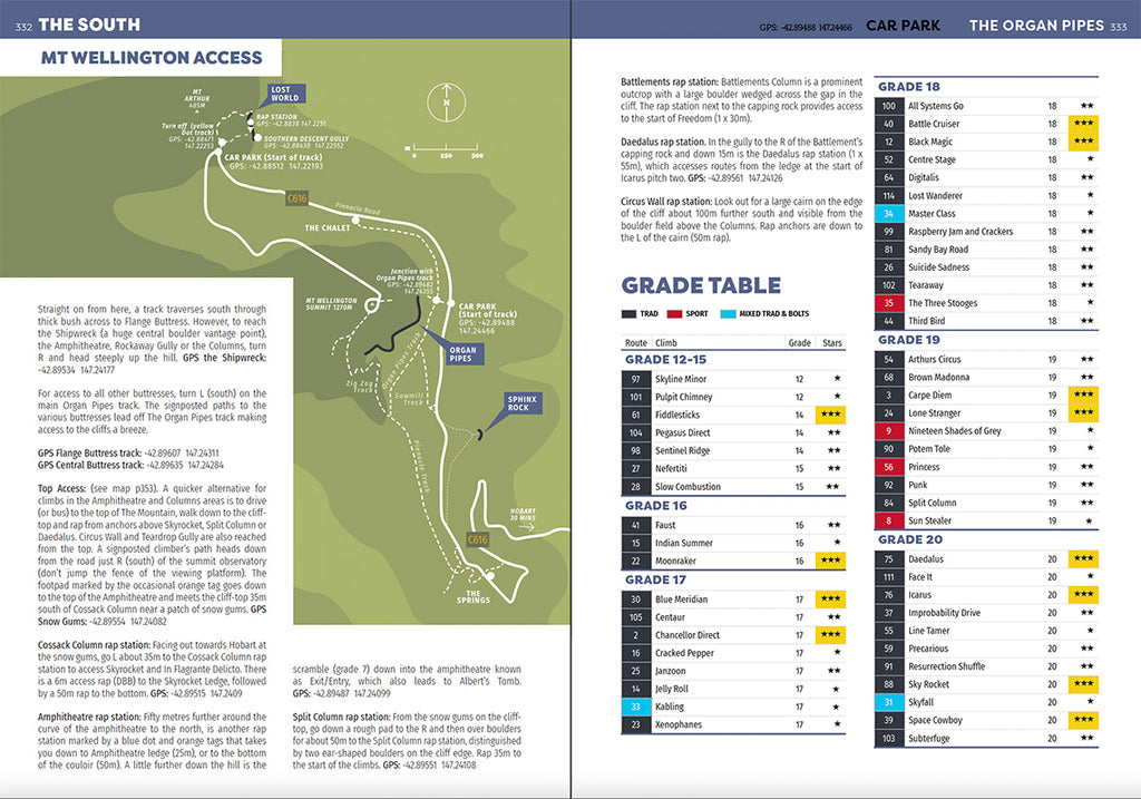 Africa, Bare Rock, Ben Lomond, Blackwood Rocks, Cape Raoul, Cataract Gorge, Cloudy Bay, Cluan Tiers, Cradle Mountain, Devils Gullet, Federation Peak, Flinders Island, Frenchmans Cap, Freycinet, Fruehauf, Mersey Cliffs, Mt Blackwood, Mt Brown, Mt Geryon, Mt Roland, North Esk, North Sister, Organ Pipes, Pavement Bluff, Rocky Cape, Sand River, Sisters Beach, South Esk, South Sister, Stacks Bluff, Teapot Rocks, The Moai, The Acropolis, Totem Pole, Township Creek, Tyndall Range, West Coast Crags and Bouldering Guide.